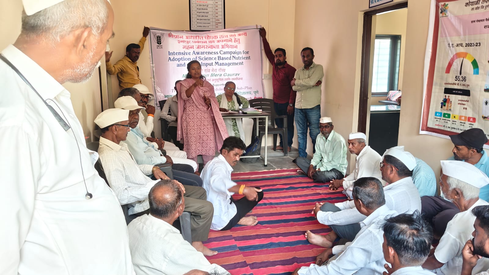 Under the Intensive Awareness Campaign for Adoption of Science-Based Nutrient and Other Input Management, a training-cum-awareness programme was organized at Kahu Koyali village, Taluka Khed, District Pune. The programme aimed to promote the judicious and balanced application of fertilizers and to educate farmers on reducing excessive fertilizer use. The programme was conducted by Dr. Karuppaiah, Sr. Scientist (Entomology), Mrs. Ashwini Benke, Scientist (Genetics) and Dr. Yogesh Khade, Sr. Scientist (Hort.). A total of 23 (20 Male +3 Female) participants attended the programme.